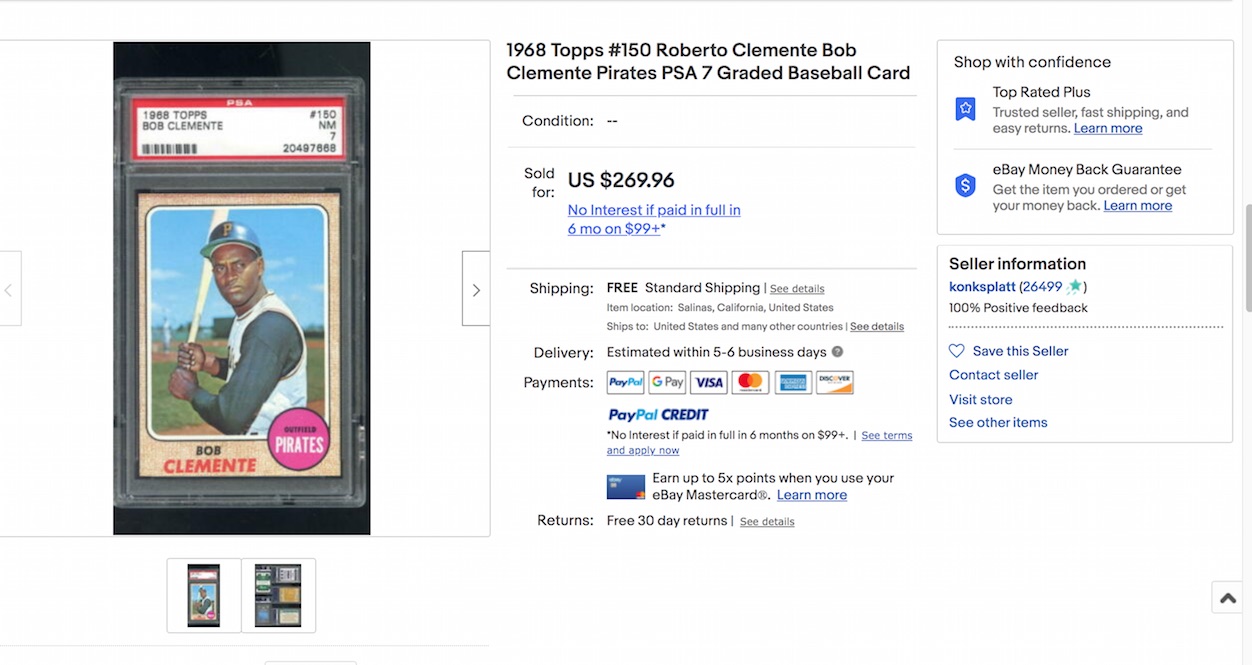 A 1968 PSA 7 Roberto Clemente sold on eBay on January 28, 2021, 2021, for $269.96 | $275 - $300 |