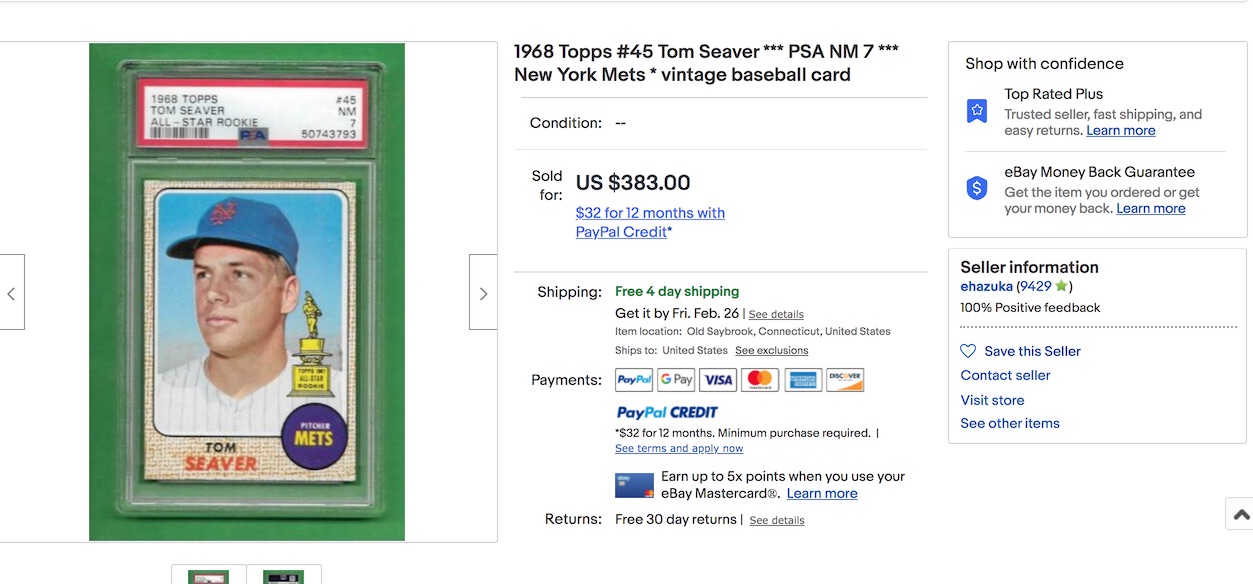 A 1968 Topps PSA 7 Tom Seaver sold on eBay on February 14, 2021, for $383 | $325 - $400 |