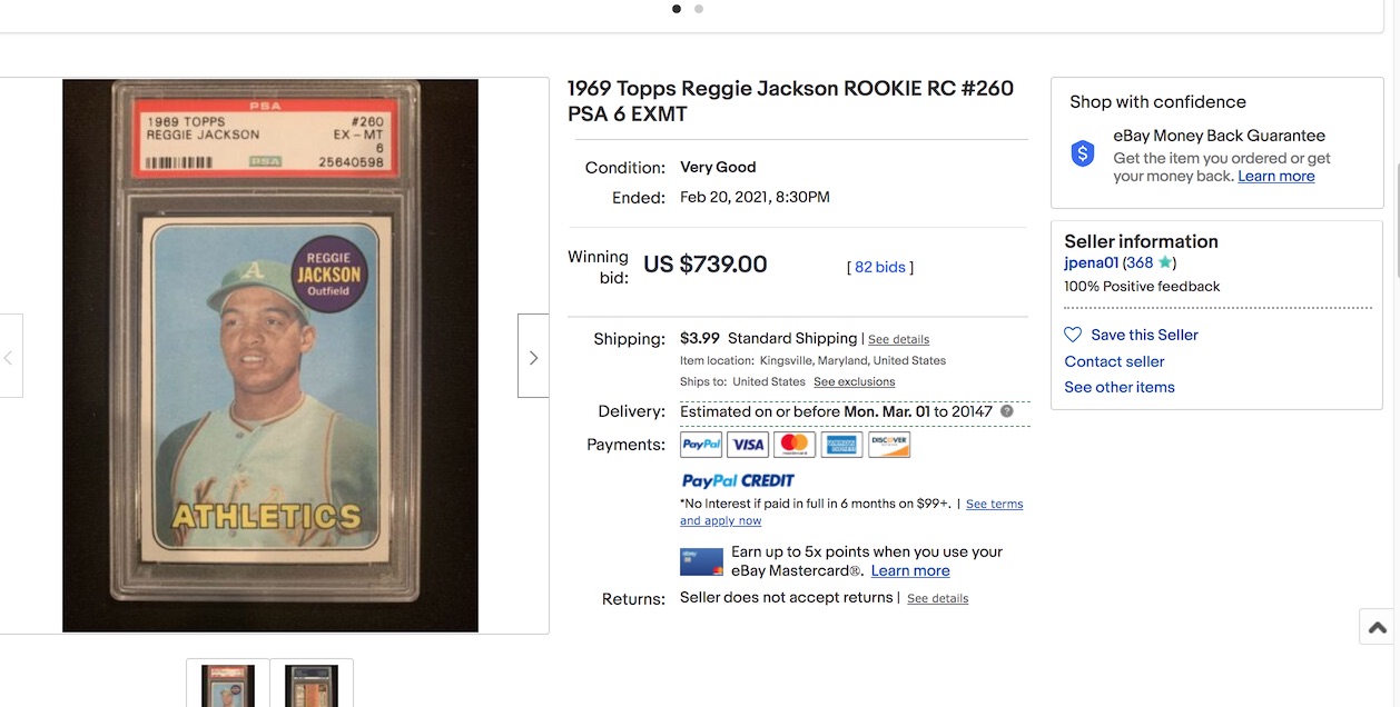A 1969 Topps PSA 6 Reggie Jackson sold on eBay on February 20, 2021, for $739 | $450 - $650 |