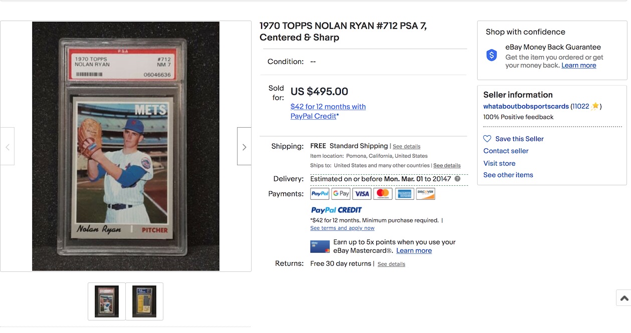 A 1970 Topps PSA 7 Nolan Ryan sold on eBay on February 3, 2021, for $495 | $450 - $550 |