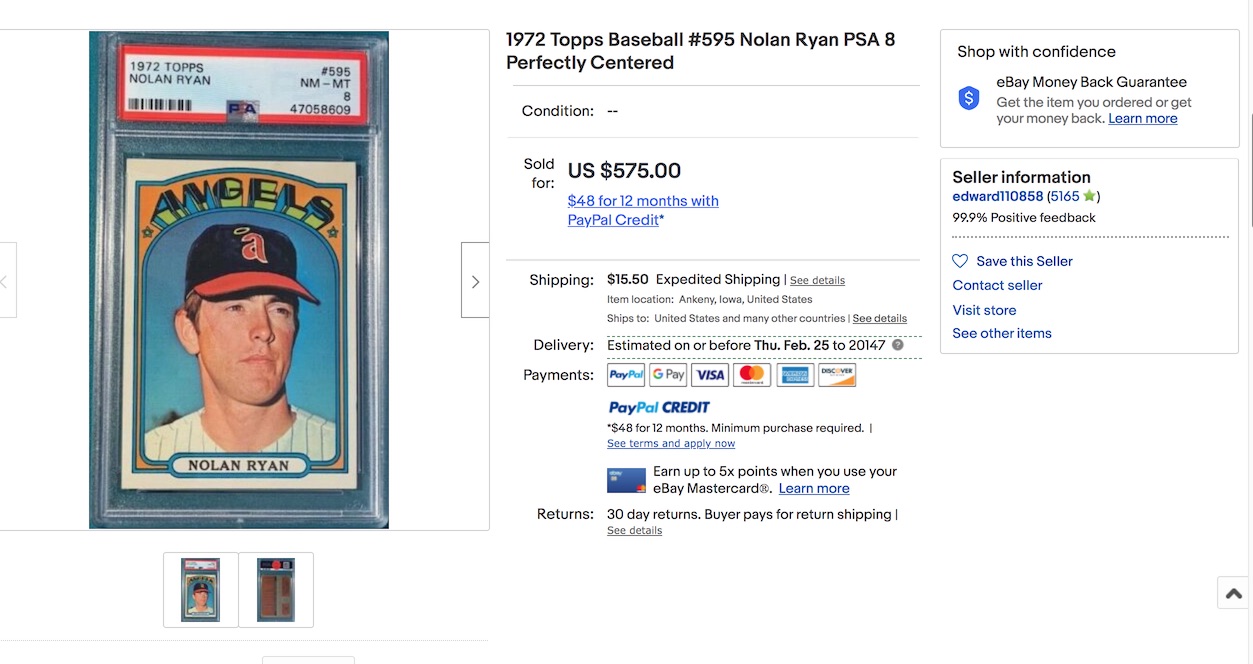 A 1972 PSA 8 Nolan Ryan sold on eBay on February 15, 2021, for $575 | $450 - $650 |