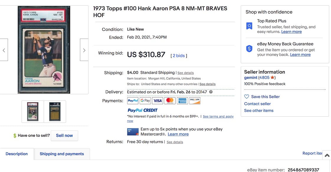 A 1973 Topps PSA 8 Hank Aaron card sold on eBay on February 20, 2021 for $310.87 | $275 - $350 |
