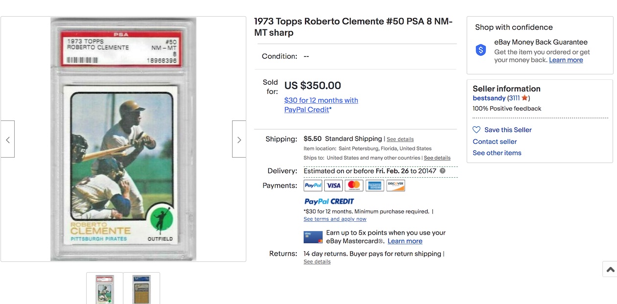 A 1973 Topps PSA 8 Roberto Clemente sold on eBay on February 15, 2021, for $350 | $300 - $400 |