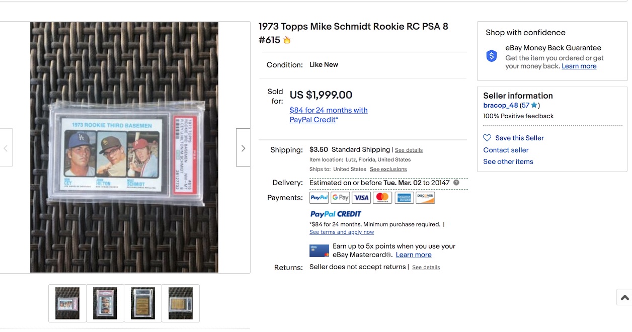 A 1973 Topps PSA 8 Mike Schmidt card sold on eBay on February 20, 2021 for $1999 | $1400 - $1800 |
