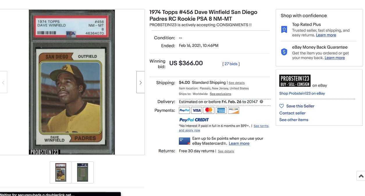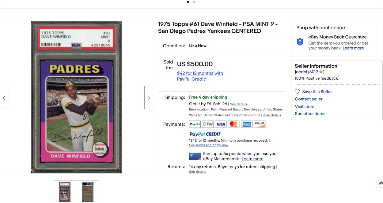 A 1975 Topps PSA 9 Dave Winfield sold on eBay on February 21, 2021, for $500 | $400 - $600 |