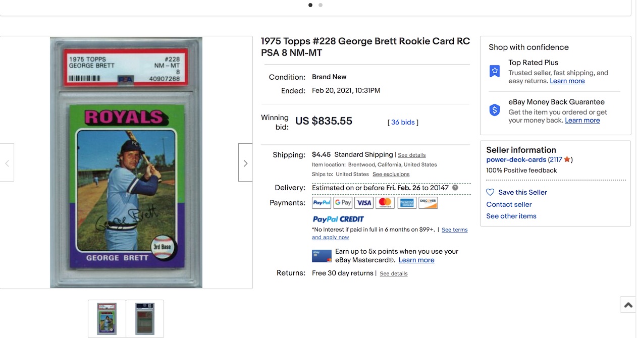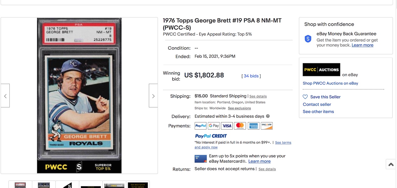 A 1976 Topps PSA 8 George Brett sold in February 2021 for $1802.00. | $600 - $750 |