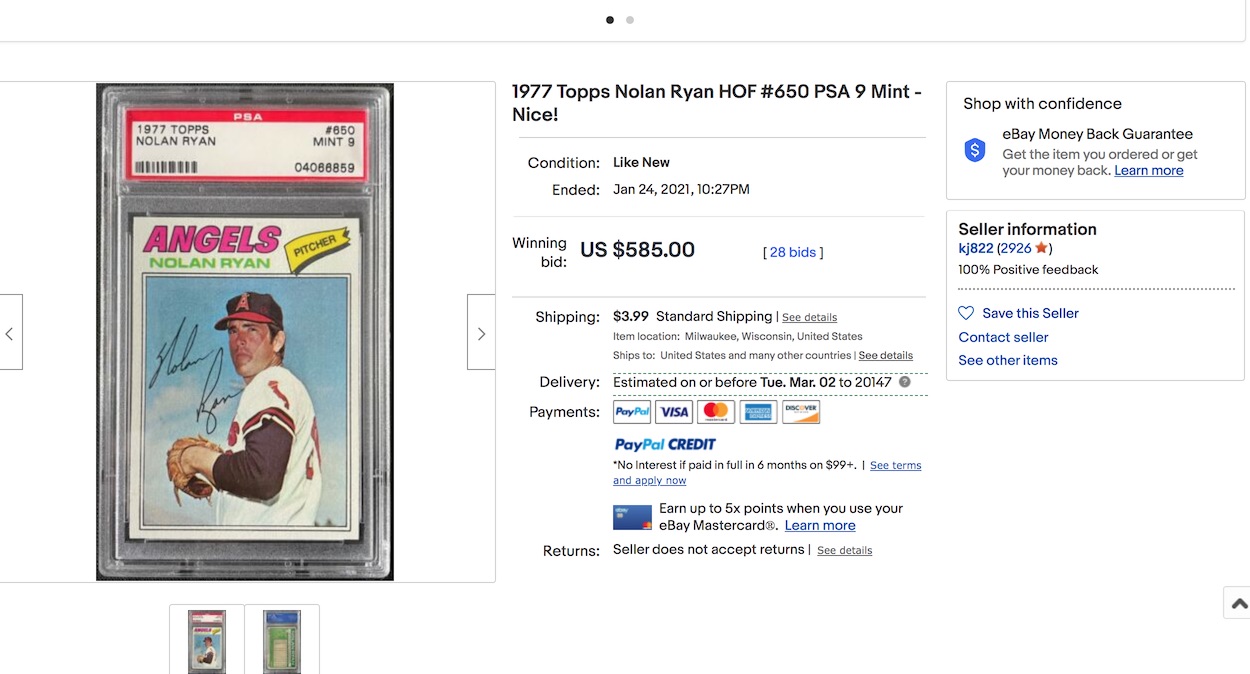 A 1977 Topps PSA 9 Nolan Ryan sold on eBay on January 24, 2021, for $585 | $550 - $700 |