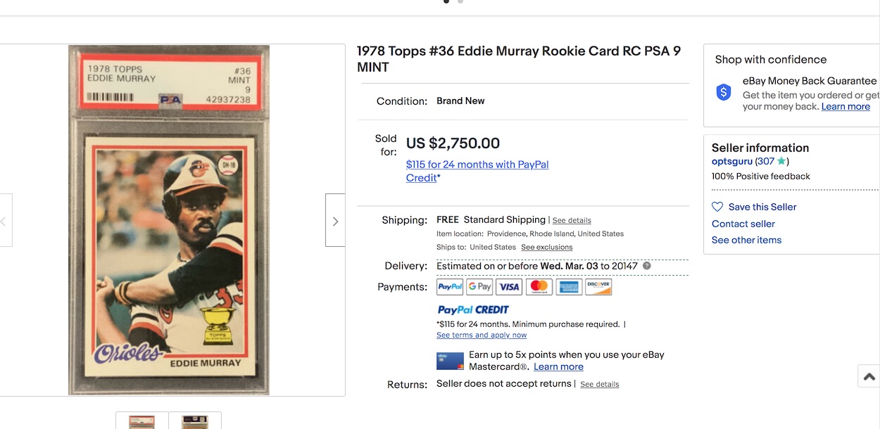 A 1978 Topps PSA 9 Eddie Murray sold on eBay on February 20, 2021, for $2750 | $1500 - $2500 |
