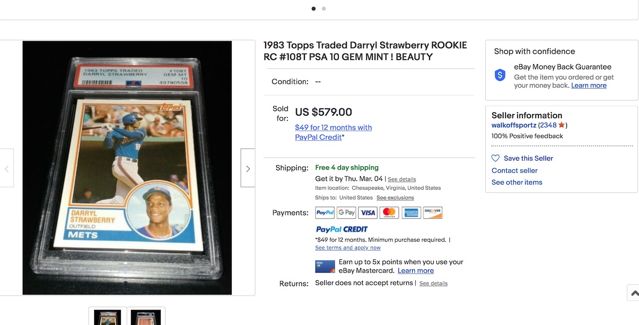 a 1983 Topps Traded PSA 10 Darryl Strawberry cold on eBay on February 25, 2021, for $579.99 | $500 - $600 |