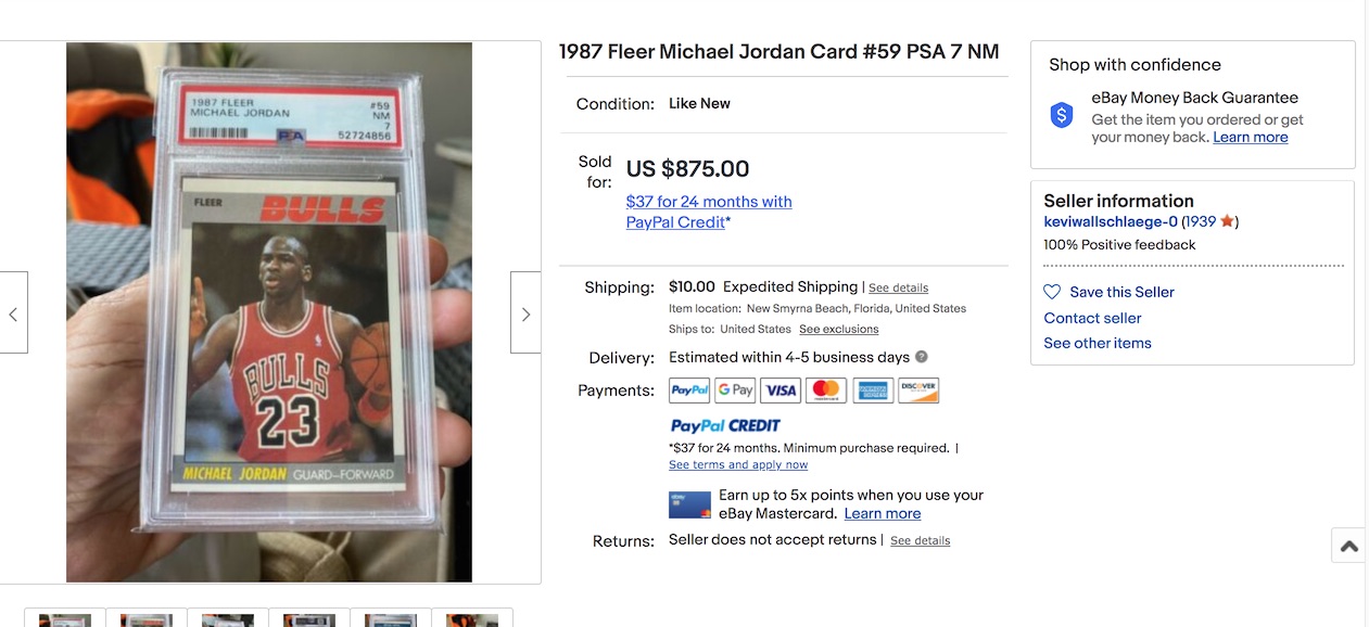 A 1987-88 Fleer Michael Jordan PSA 7 sold on eBay on February 25, 2021, for $875 | $700 - $900 |