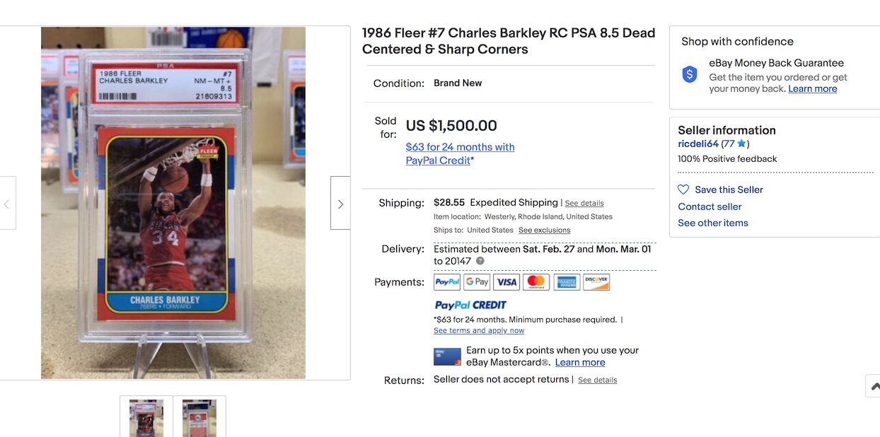 A 1986 Fleer Charles Barkley PSA 8.5 sold on eBay on February 17, 2021, for $1,500 | $1100 - $1500 |