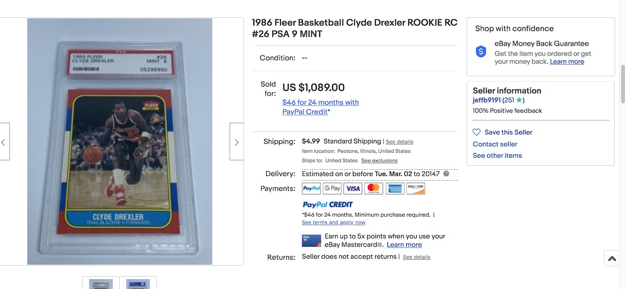 A 1986 Fleer Clyde Drexler PSA 9 sold on eBay on February 12, 2021, for $1,089 | $850 - $1100 |