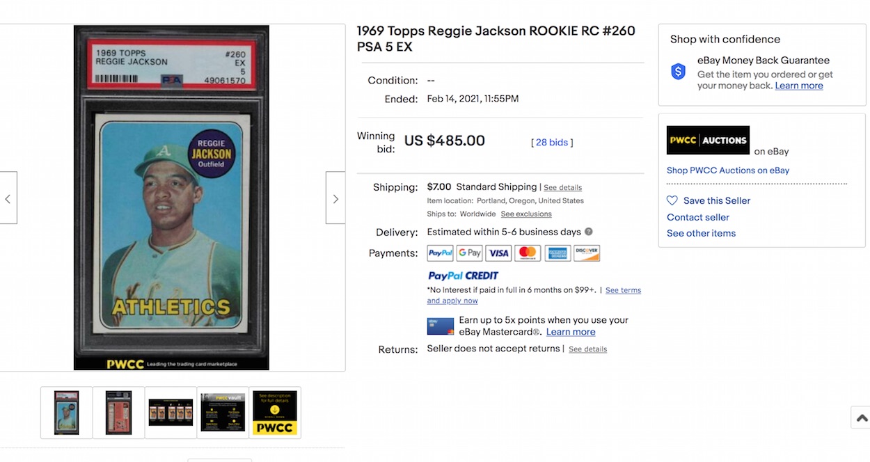 A 1969 Topps PSA 5 Reggie Jackson sold on eBay on February 14, 2021, for $485 | $350 - $500 |