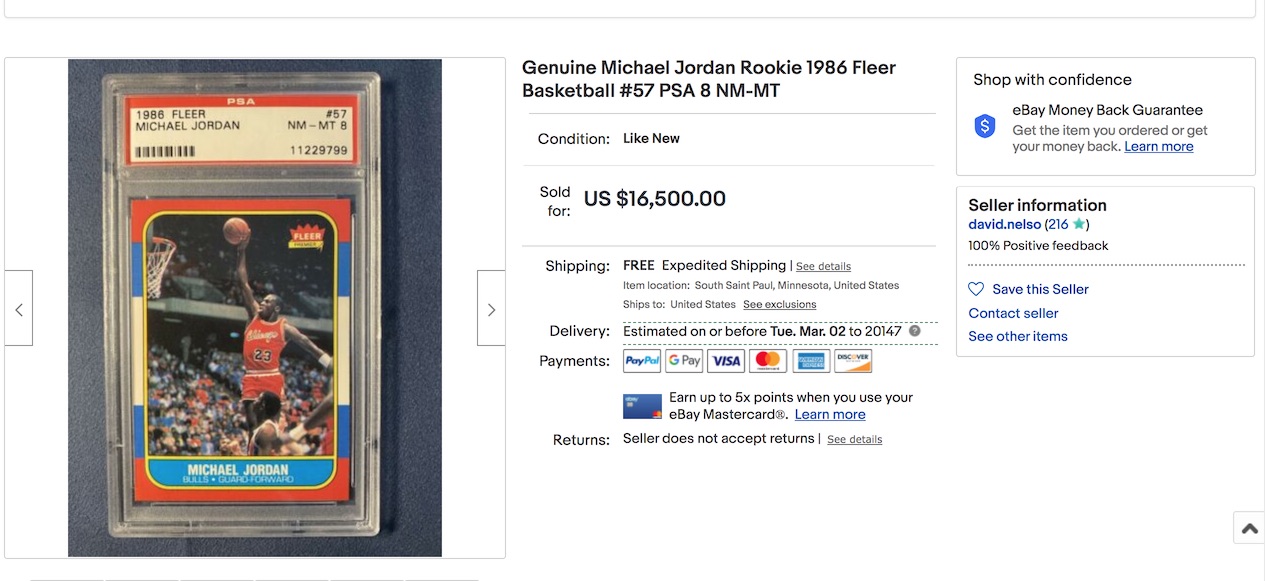 A 1986 Fleer Michael Jordan (PSA 8) sold on eBay on February 18, 2021, for $16,500 | $11,000 - $15,000 |