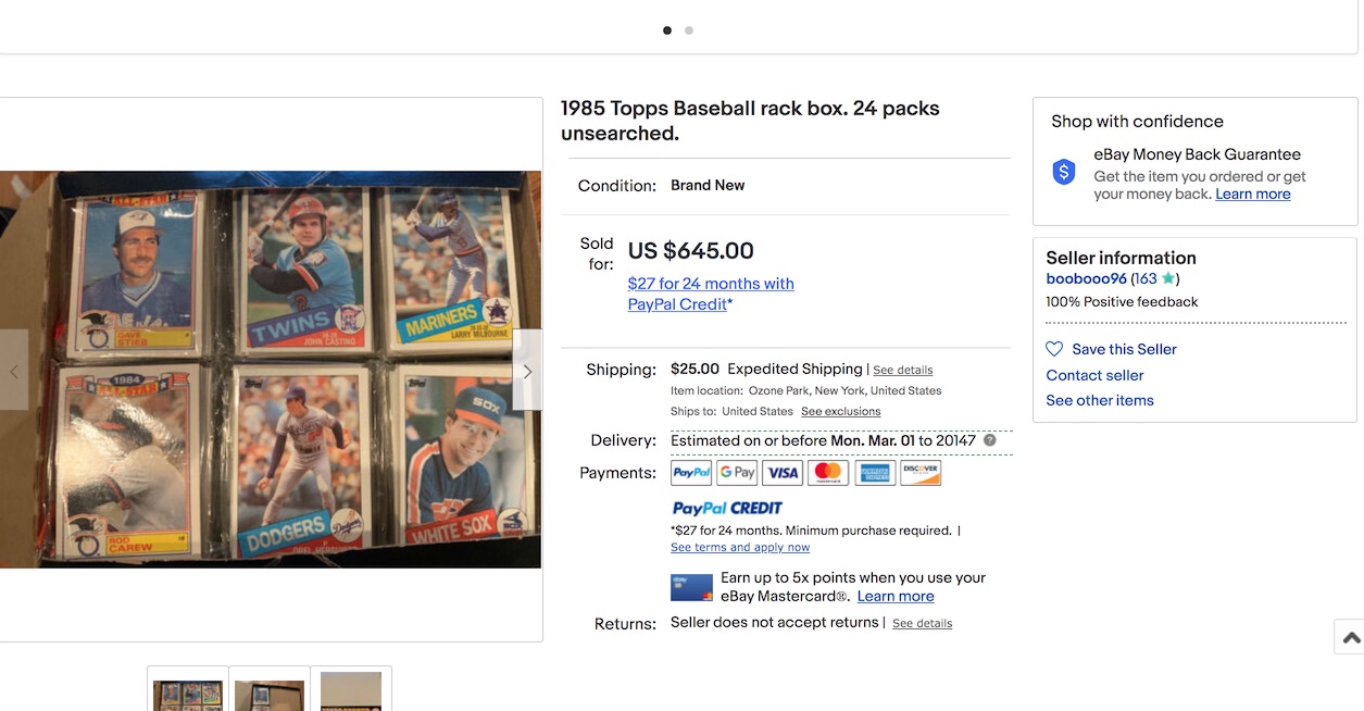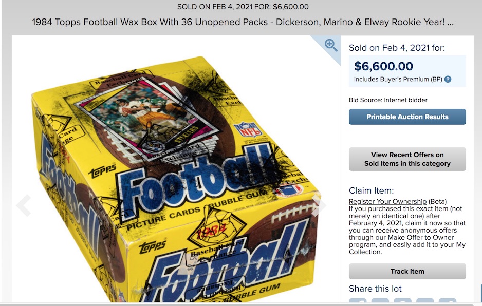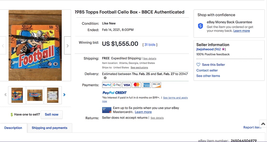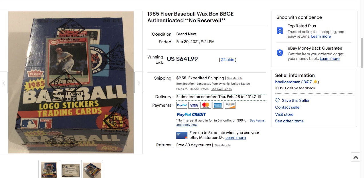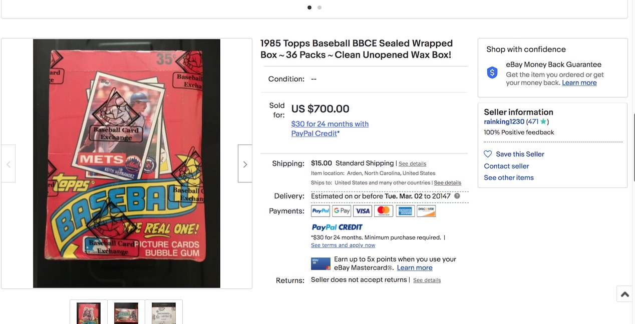 A 1985 Topps wax box sold on eBay on February 20, 2021 for $700 | $650 - $750 | |
