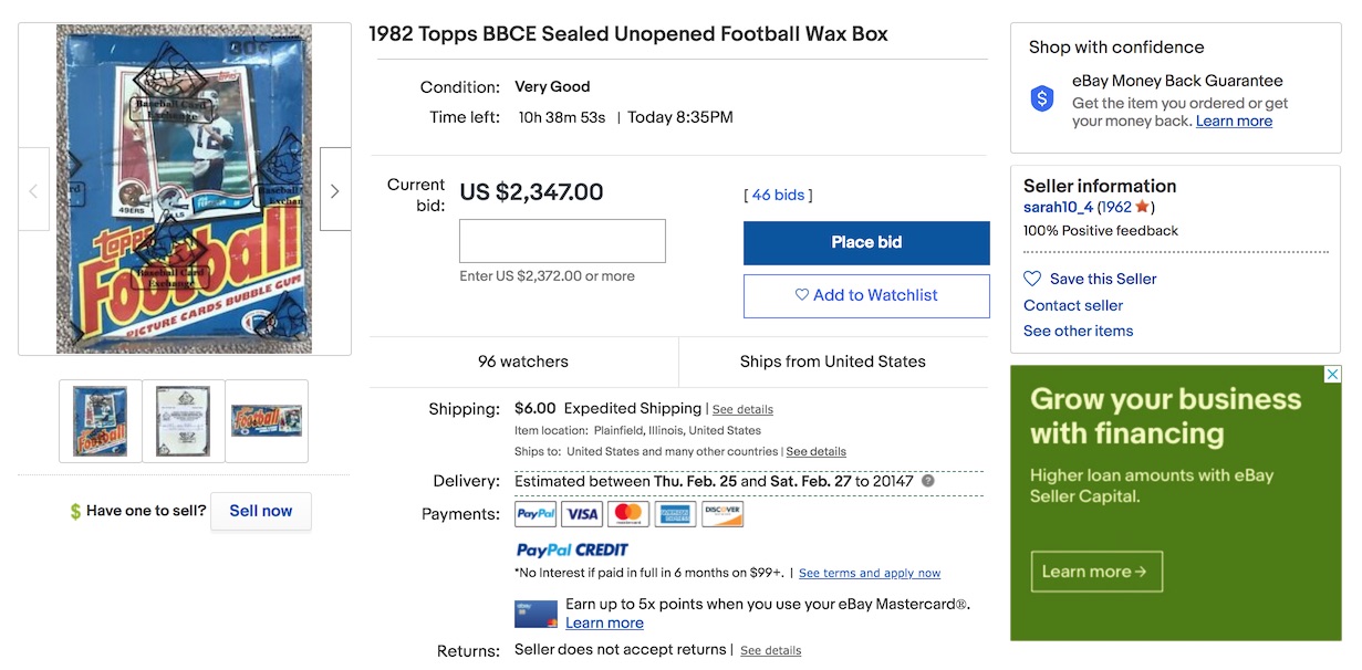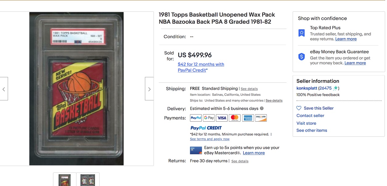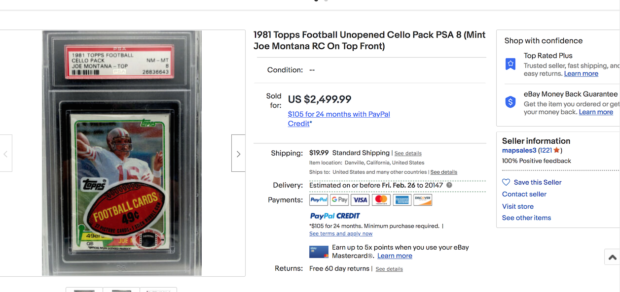 Last 1981 Topps Cello with Montana on top sold on eBay on February 11, 2021, for $2499 The last 1981-82 Topps Basketball Wax Pack sold on eBay on February 19, 2021 for $499.96 |