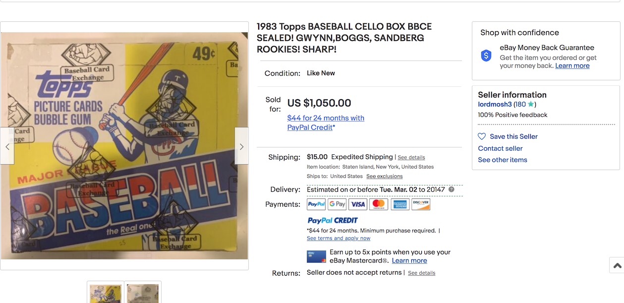 A 1983 Topps cello box sold on eBay on February 16, 2021, for $1050 | $1000 - $1200 | ,