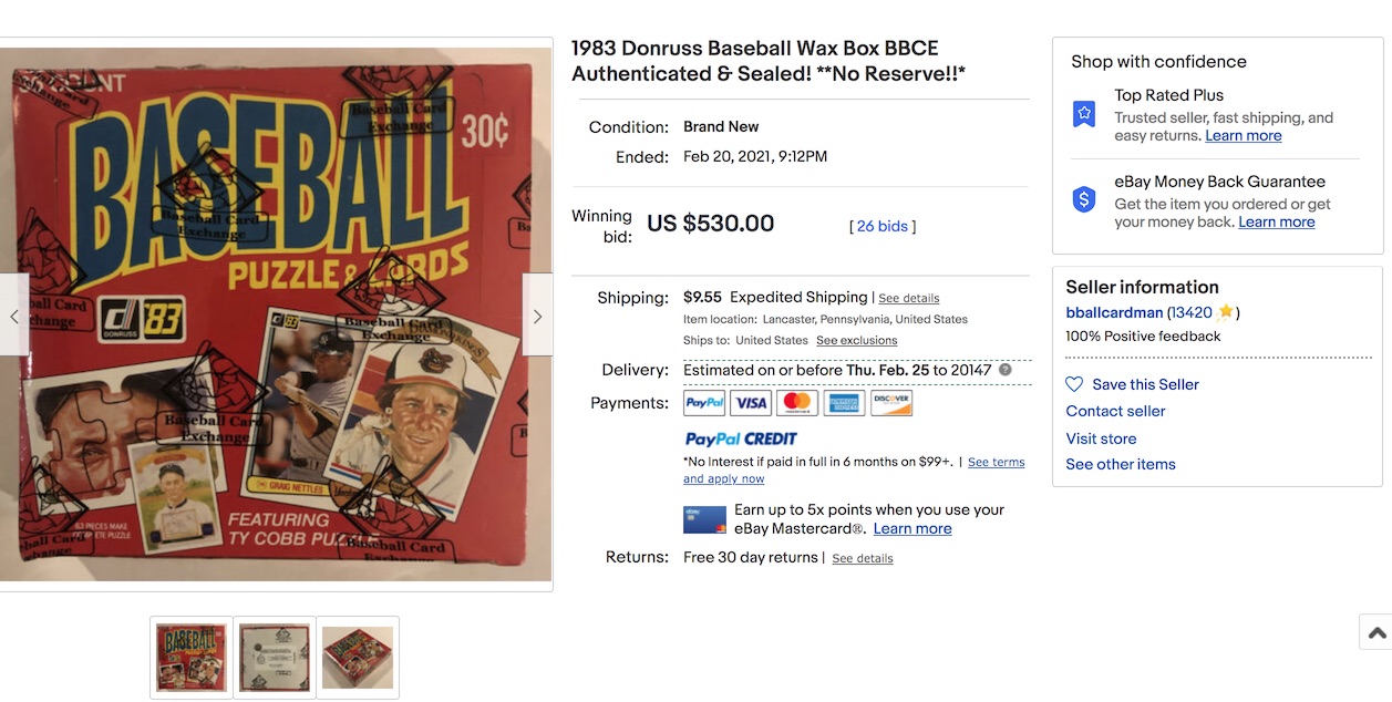 A 1983 Donruss wax box sold on eBay on February 20, 2021, for $530 | $375 - $500 | |