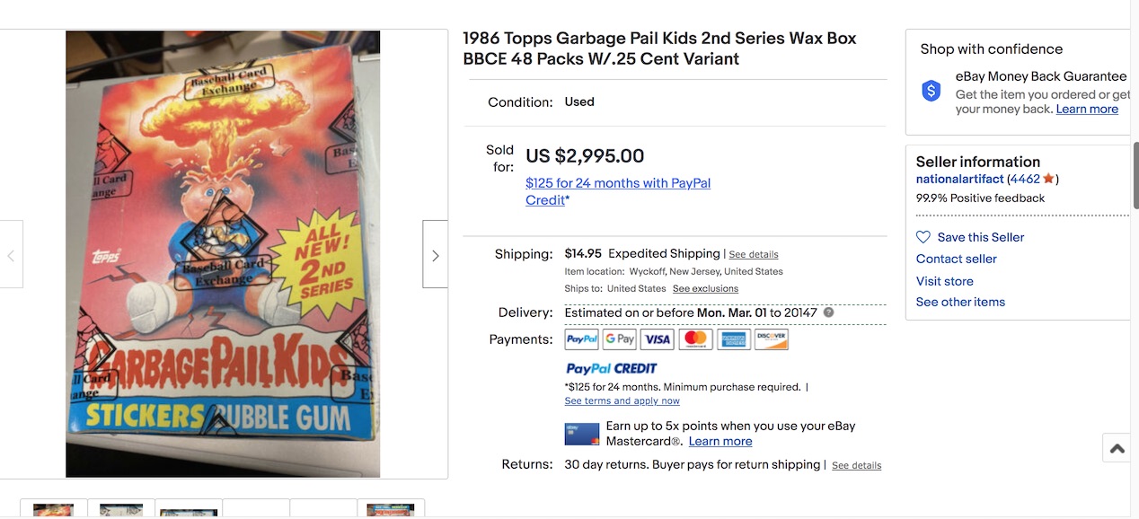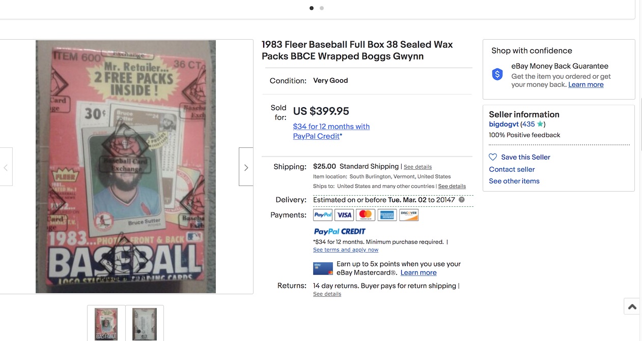 A 1983 Fleer Wax Box sold on eBay on February 16, 2021, for $399.95 | $325 - $400 | |