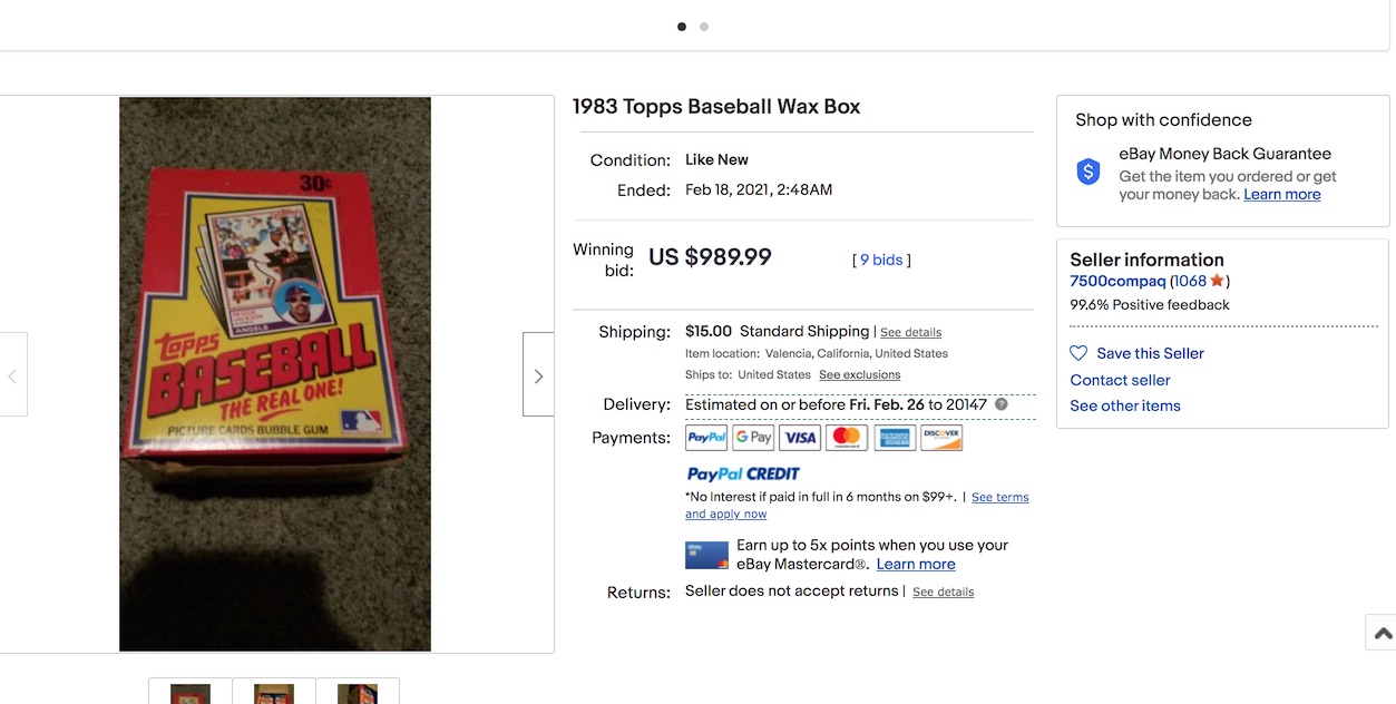 A 1983 Topps wax box sold on eBay on February 16, 2021, for $989.99 | $800 - $900 |