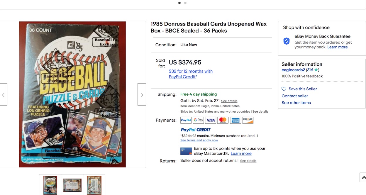 A 1985 Donruss wax box sold on eBay on February 14, 2021, for $374.50 | $275 - $350 | |