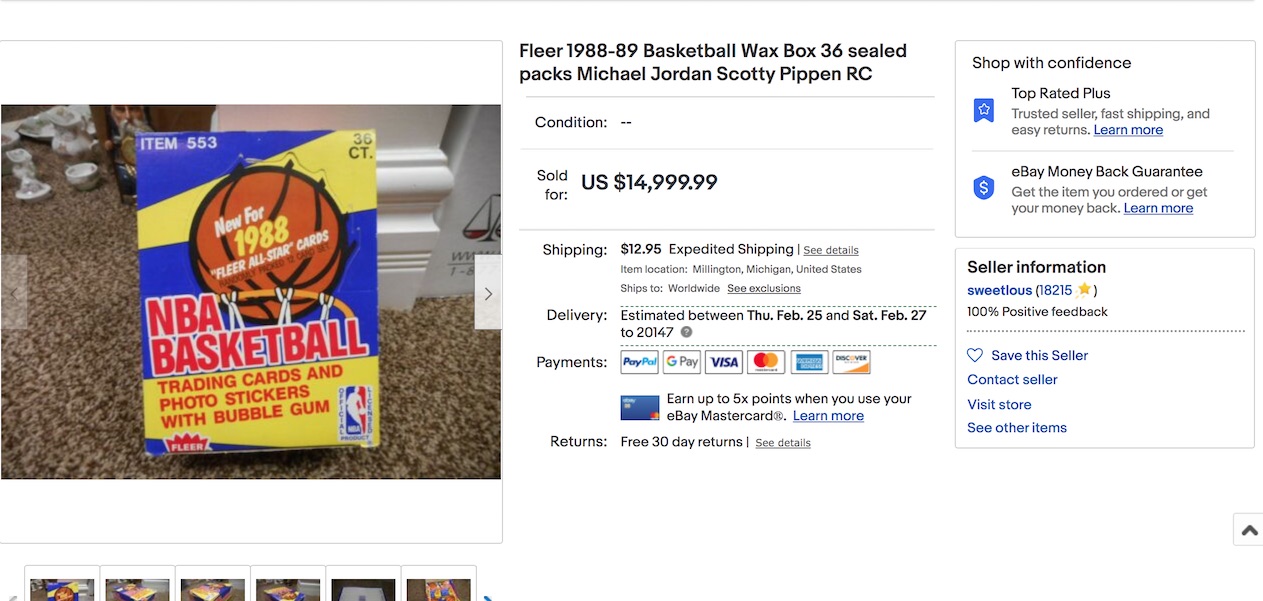 The last 1988-89 Fleer Basketball Wax Box sold for $14,999 on eBay on February 14, 2021 | $12000 - $15000 |