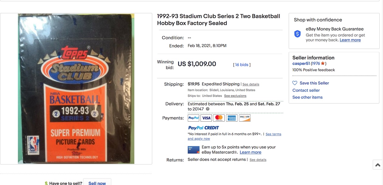 The Last 1992-93 Stadium Club Series 2 Wax Box sold on eBay on February 19, 2021 for $1009 | $800 - $1000 |